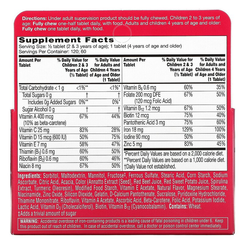 | Количество в 1 таблетке | % от суточной нормы для детей в возрасте 2–3 лет (½ жевательной таблетки) | % от суточной нормы для взрослых и детей от 4 лет (1 таблетка) | |