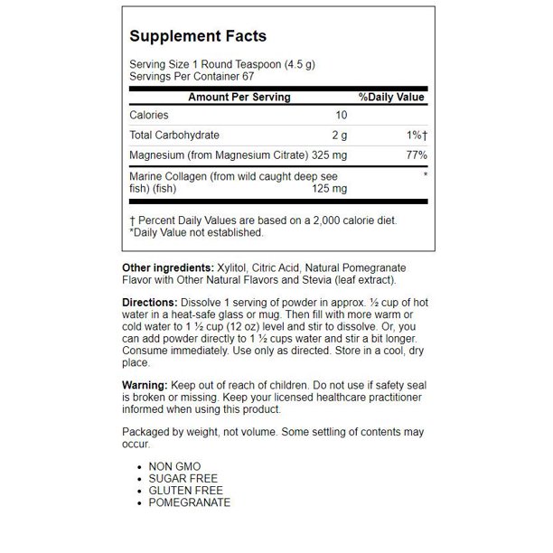 Почему магний и коллаген? Этот непревзойденный дуэт по уходу за кожей сочетает в себе цитрат магния для антиоксидантной поддержки и питательный морской коллаген. Антиоксидантная активность магния может помочь защитить клетки кожи от повреждения свободными радикалами, в то время как более мелкие белки морского коллагена могут помочь вашему телу усвоить и использовать это мощное питательное вещество, которое составляет более 70% вашей кожи. Вместе они предназначены для того, чтобы помочь вашему телу защитить ваши клетки и пополнить жизненно важный коллаген для более сияющей и упругой кожи.