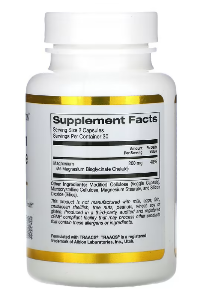 California Gold Nutrition Magnesium Bisglycinate — это форма магния с высокой степенью усвоения, изготовленная с использованием TRAACS®. TRAACS® расшифровывается как «Настоящая хелатная система аминокислот», которая была создана Albion Laboratories и подтверждена рядом патентов и опубликованных исследований.