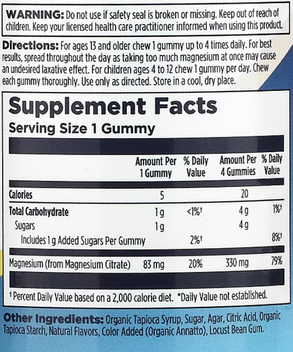 Детям от 13 лет и старше жуйте по 1 жевательной резинке до 4 раз в день. Для достижения наилучших результатов распределяйте в течение дня, так как прием слишком большого количества магния может вызвать нежелательный слабительный эффект. Для детей в возрасте от 4 до 12 лет жуйте по 1 жевательной резинке в день. Тщательно пережевывайте каждую жевательную резинку. Используйте только по назначению.