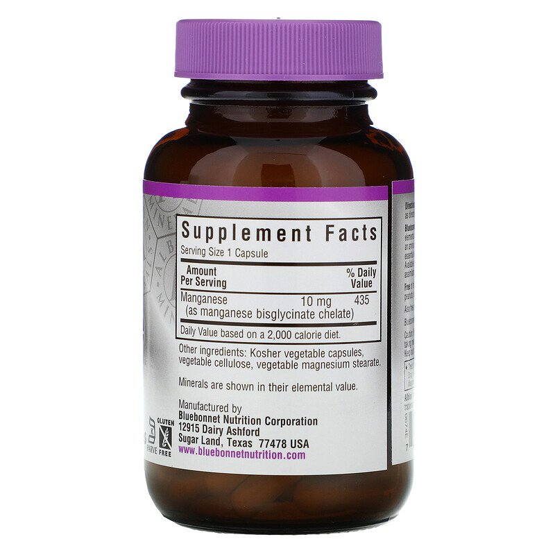 Капсулы хелатированного марганца от Bluebonnet содержат 10 мг элементарного марганца из полностью прореагировавшего бисглицината марганца, хелатированного аминокислотой минерала из Альбиона. Доступен в удобных для глотания растительных капсулах, обеспечивающих максимальное усвоение и поглощение.