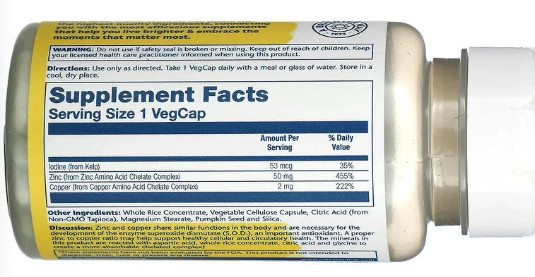 Цинк и медь выполняют схожие функции в организме и необходимы для выработки фермента супероксиддисмутазы (СОД), важного антиоксиданта. Правильное соотношение цинка и меди может помочь поддерживать здоровье клеток и кровообращения. Минералы в этом продукте реагируют с аспарагиновой кислотой, концентратом цельного риса, лимонной кислотой и глицином для создания более усваиваемого хелатного комплекса.