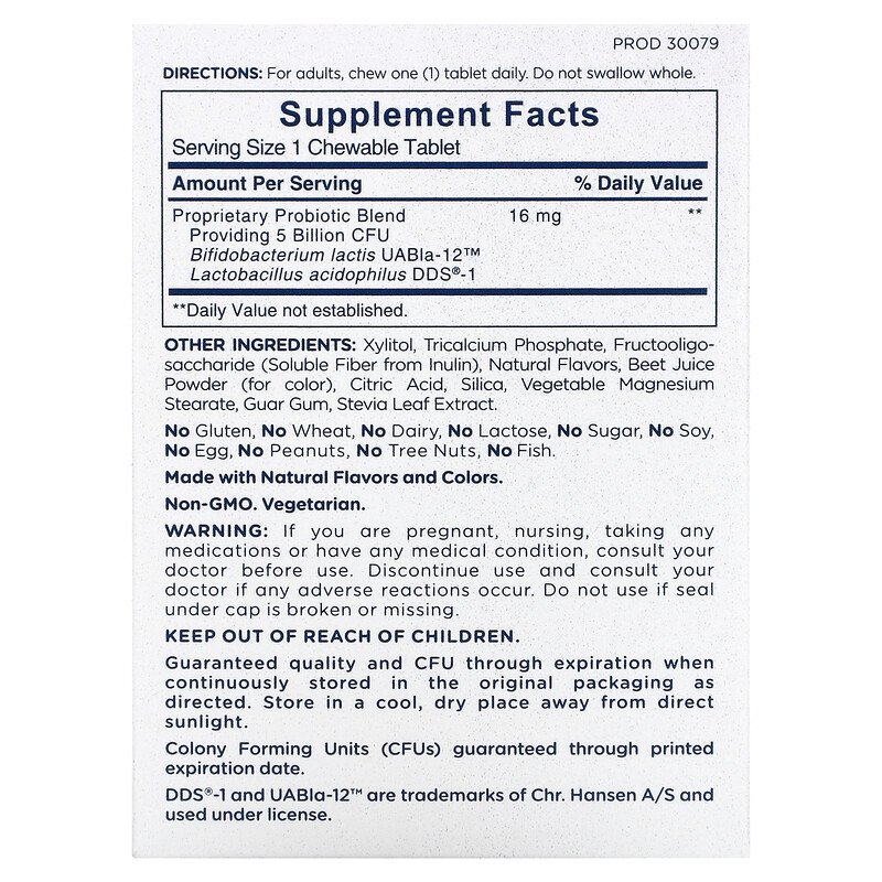 Запатентованная смесь пробиотиков Обеспечивает 5 млрд КОЕ Бифидобактерии молочные UABla-12 ™ Ацидофильные лактобактерии DDS®-1 |
