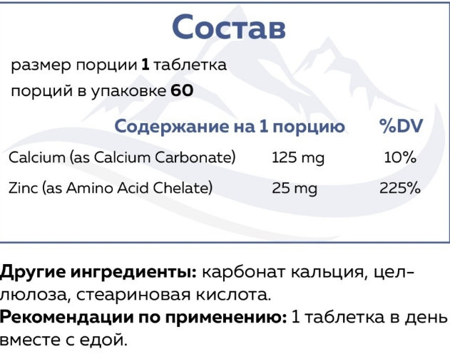 - Цинк (в форме хелата бисглицината цинка) 25 мг 10%
