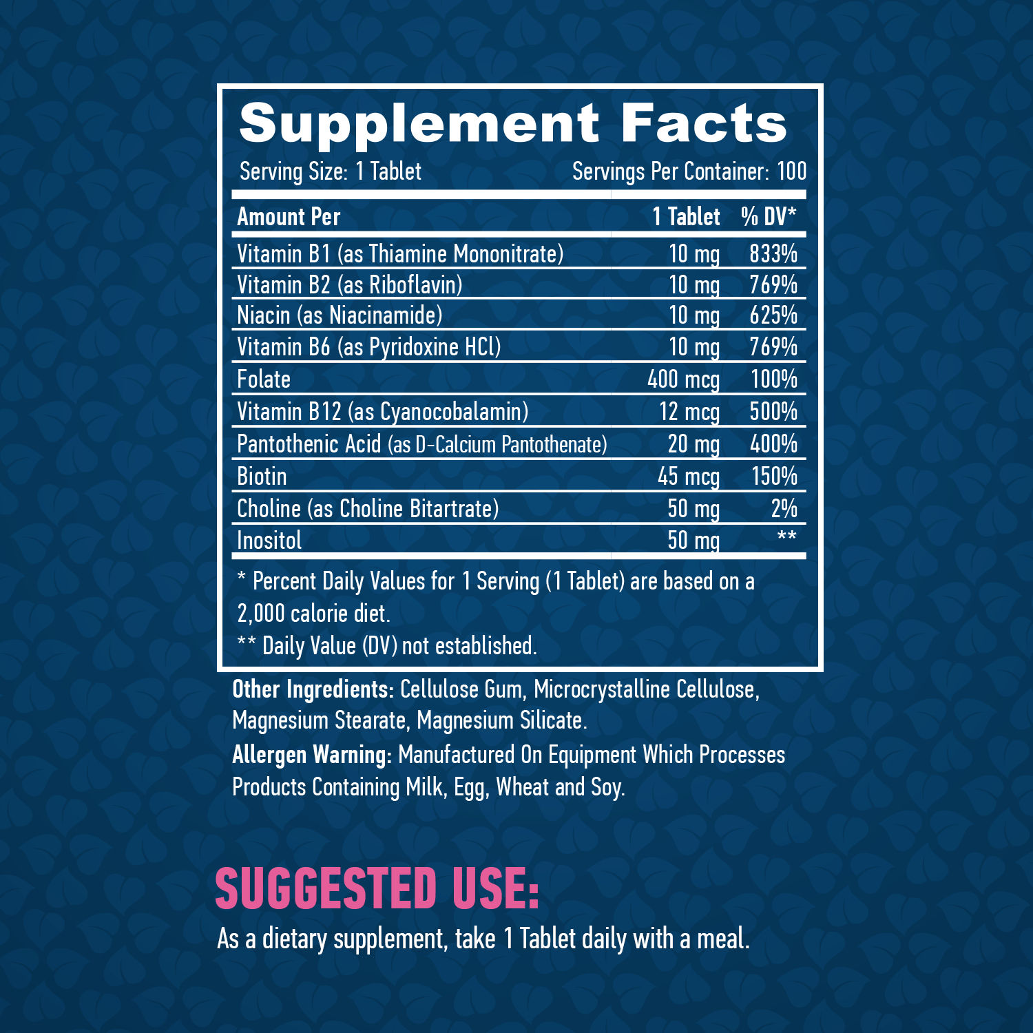 Состав: 10 мг тиамина,10 мг Рибофлавина, 10 мг витамина В6, 100 мг Ниацина, 400 мг Фолиевой кислоты, 12 мг витамина В12, 45 мг Биотина, 20 мг Пантотеновой кислоты, 50 мг Холина, 50 мг Инозита на порцию.