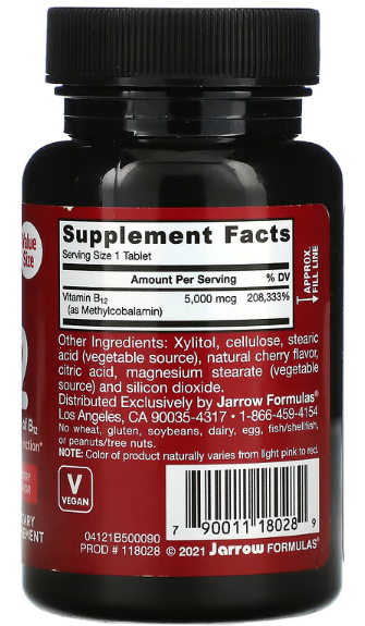 Метил B-12 (метилкобаламин) поддерживает здоровье и функцию мозга и нервной системы, выработку энергии и циклы сна и бодрствования. Метил B-12 усваивается и удерживается лучше, чем цианокобаламин, поэтому пожилым людям, лицам, принимающим препараты для снижения кислотности желудка, а также некоторым вегетарианцам/веганам могут потребоваться добавки.