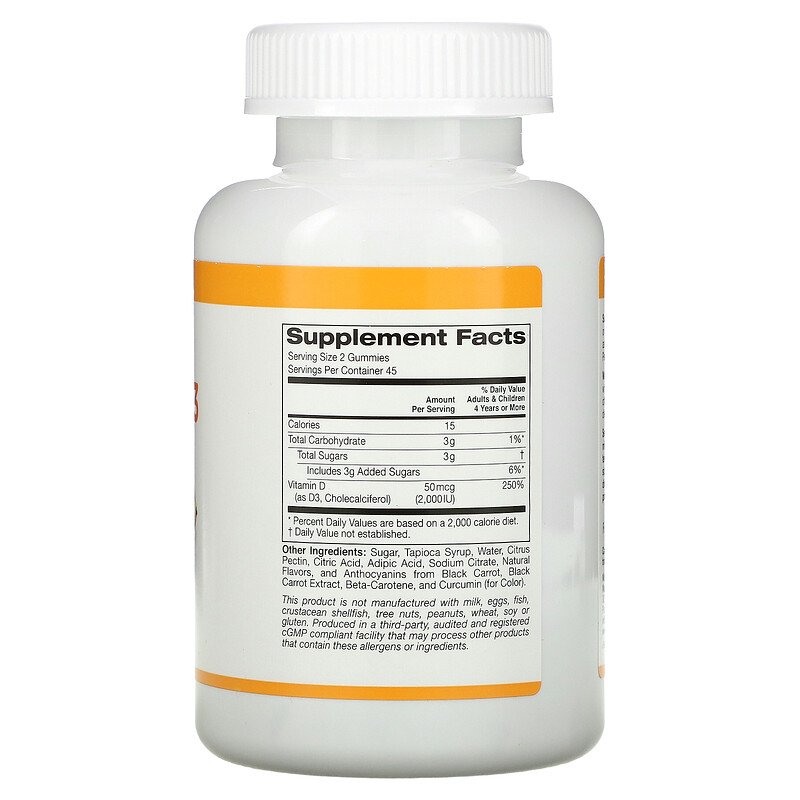 California Gold Nutrition Vitamin D3 Gummies (витамин D3 без желатина и глютена) со вкусом фруктов и ягод 25 мкг (1000 МЕ) 90 жевательных таблеток