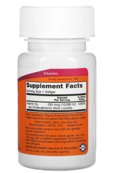 Vitamin D-3 10000 IU от Now Foods – это добавка с повышенной дозировкой витамина D-3, которая идеально подходит для быстрого устранения дефицита вещества в организме. Витамин D оказывает влияние на многие ткани и процессы, потому его недостача можете ощутимо ухудшать состояние здоровья. Витамин улучшает здоровье кожи, способствует разглаживанию морщин. Вещество снижает воспалительные процессы и боли в суставах, повышает их плотность и ускоряет восстановление. Также микроэлемент необходим для усвоения кальция, что влияет на плотность и скорость восстановления костных тканей.