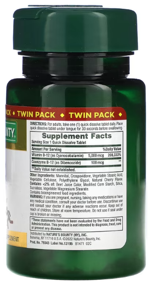 Nature's Bounty B-12 (Витамин B-12) натуральная вишня 5000 мкг 40 быстрорастворимых таблеток