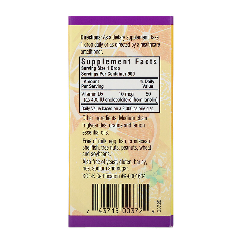 Жидкий витамин D3 от Bluebonnet в каплях содержит 400 МЕ натурального витамина D3 (холекальциферол) из ланолина. Каждая капля этого «солнечного» витамина ароматизирована небольшим количеством эфирных масел апельсина и лимона. Поставляется в виде жидких капель для максимального усвоения и лучшей абсорбции.
