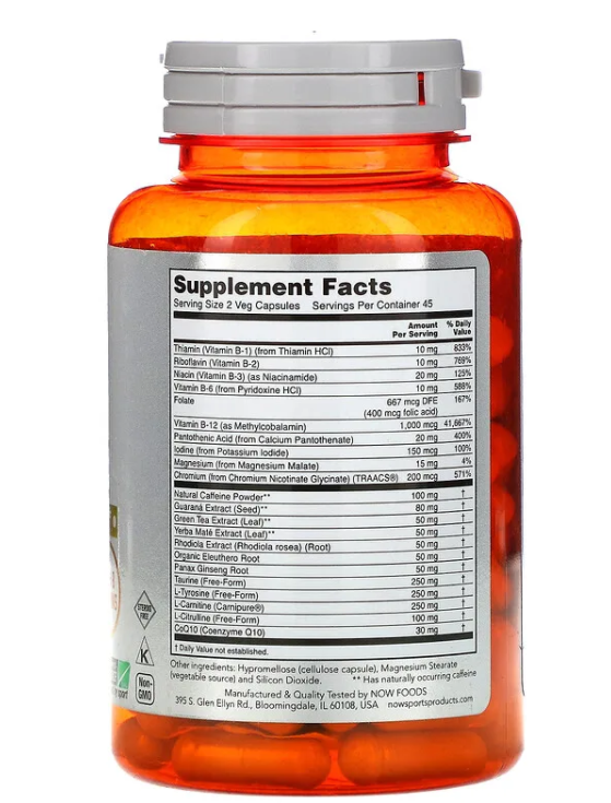 NOW Sports Energy Extreme – это целый комплекс различных компонентов для увеличения энергии и достижений в спорте. В составе водорастворимые витамины В1, В2, В3, В5, В6, В9, В12, а также хром, магний, йод. В числе растительных экстрактов корень женьшеня, порошок кофеина, гуараны, листьев зеленого чая (камелии китайской), мате, родиолы розовой, элеутерококк. Кроме того, препарат содержит таурин, тирозин, карнитин, цитруллин и коэнзим Q10. Йод, хром, магний эффективно помогают нервной системе справляться с нагрузками, а комплекс растительных экстрактов выполняет роль адаптогена и дает выраженный стимулирующий эффект для всего организма.