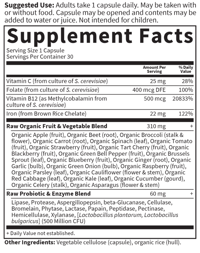 - Содержит 22 мг щадящего цельного пищевого железа и цельные пищевые витамины С, В12 и фолиевую кислоту для поддержки усвоения и использования железа